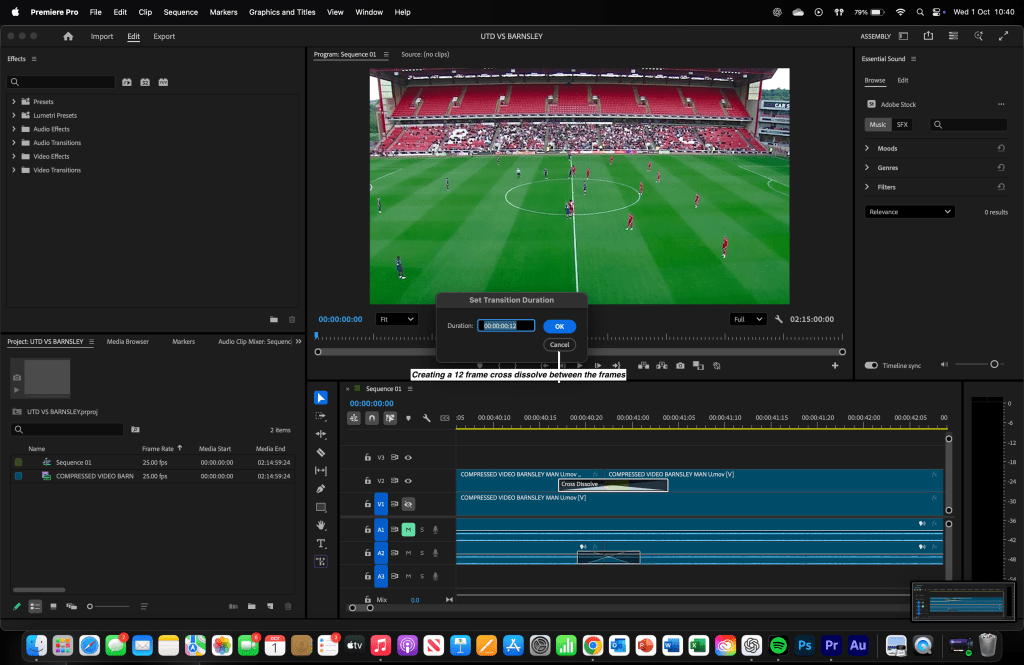 I was tasked with creating a very simple football highlight reel, using video clips that only included the kickoff, goals, and full-time whistle. Between each clip, I added a 12-frame cross dissolve in line with the style guide. This project serves as the foundation, from which we’ll progress to more advanced editing techniques and multi-camera coverage instead of relying on just one. The match used for this edit was Manchester United vs Barnsley from the 2023/24 season.